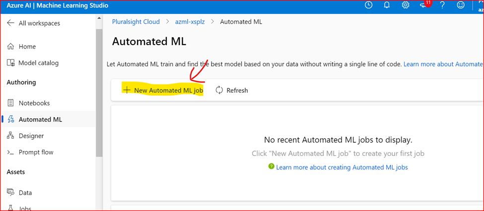 We're just going to focus on automated machine learning. Let's head over to the Automated Machine Learning tab, about the only thing we can do right now is to create a new automated machine learning run.